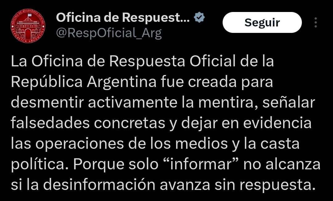 La cuenta figura como @RespOficial_Arg y, en su primer mensaje de presentación, sostuvo que “solo informar no alcanza” si la desinformación “avanza sin respuesta”. En el mismo texto, también incluyó referencias críticas hacia sectores políticos y mediáticos, y planteó que la intención es “combatir la desinformación brindando más información”.