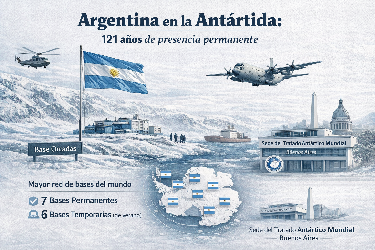 La Argentina mantiene una ocupación permanente en la Antártida desde el 22 de febrero de 1904. Ese día se fundó la Base Orcadas en la isla Laurie, al norte del sector antártico argentino, y desde entonces la bandera nacional no se ha retirado jamás del continente blanco. Durante cuatro décadas fue el único país con presencia continua en la Antártida, lo que convierte a esta base en la instalación de mayor permanencia ininterrumpida de toda la región.El dato no es menor. Mientras otras naciones llegaron después o abandonaron sus emplazamientos durante períodos de conflicto o crisis económica, Argentina mantuvo el sitio ocupado incluso cuando el acceso era una odisea. La Base Orcadas funcionó primero como observatorio meteorológico, luego pasó a jurisdicción de la Armada en 1951, y hoy es una de las siete bases permanentes que el país sostiene durante todo el año en el sexto continente.