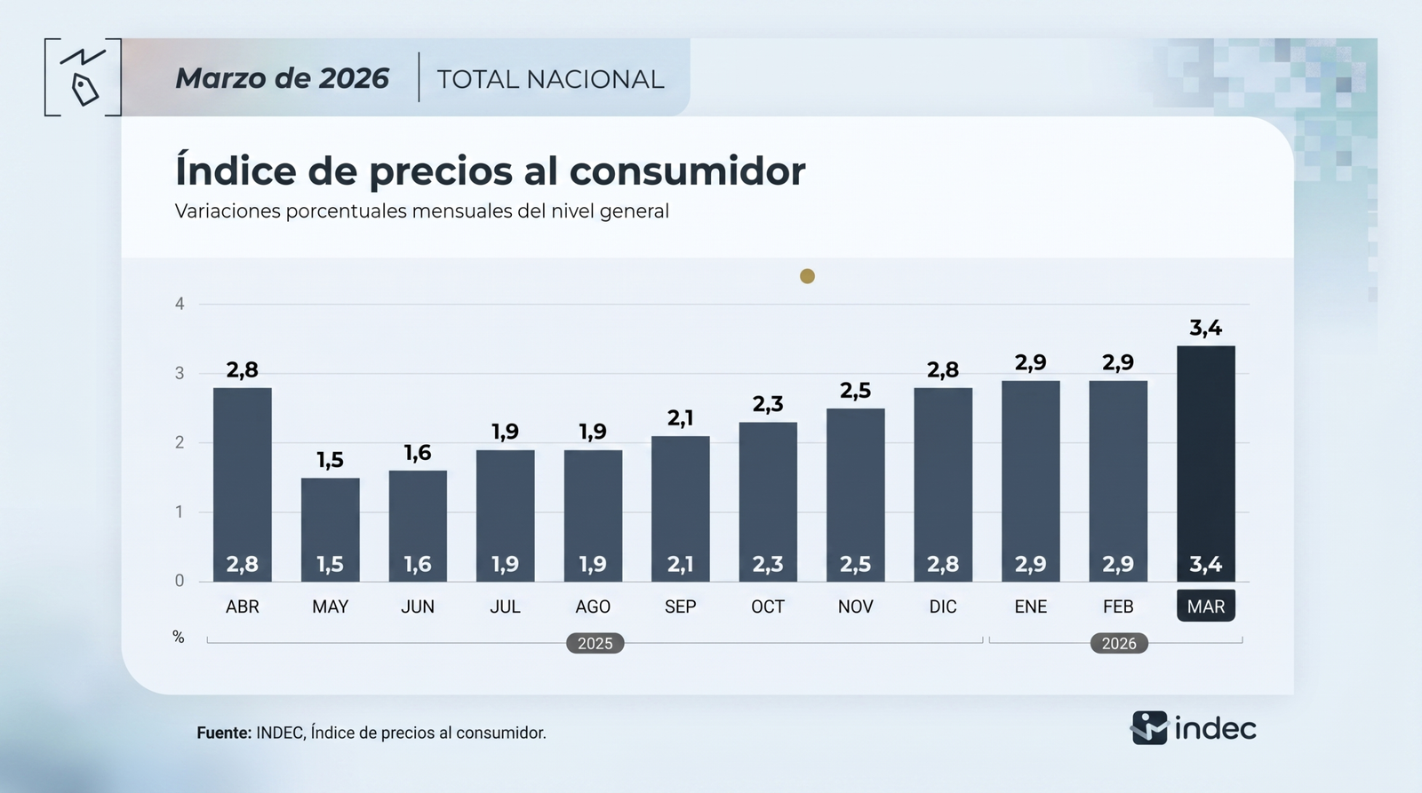 La inflación de marzo de 2026 fue de 3,4%, según los datos oficiales difundidos este 14 de abril. El número mostró una aceleración de 0,5 puntos porcentuales frente al registro de febrero, de 2,9%, y reabrió la discusión sobre la velocidad real de la desaceleración de precios en la Argentina.